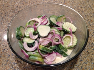 Mix yogurt, sour cream and add salt and pepper to liking and pour over sliced onion and cucumber. Stir and marinate for 1 hour, then stir before serving.