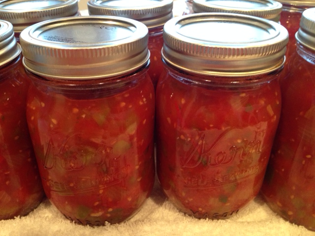 Put salsa into hot sterilized jars and seal with hot lids and bands.